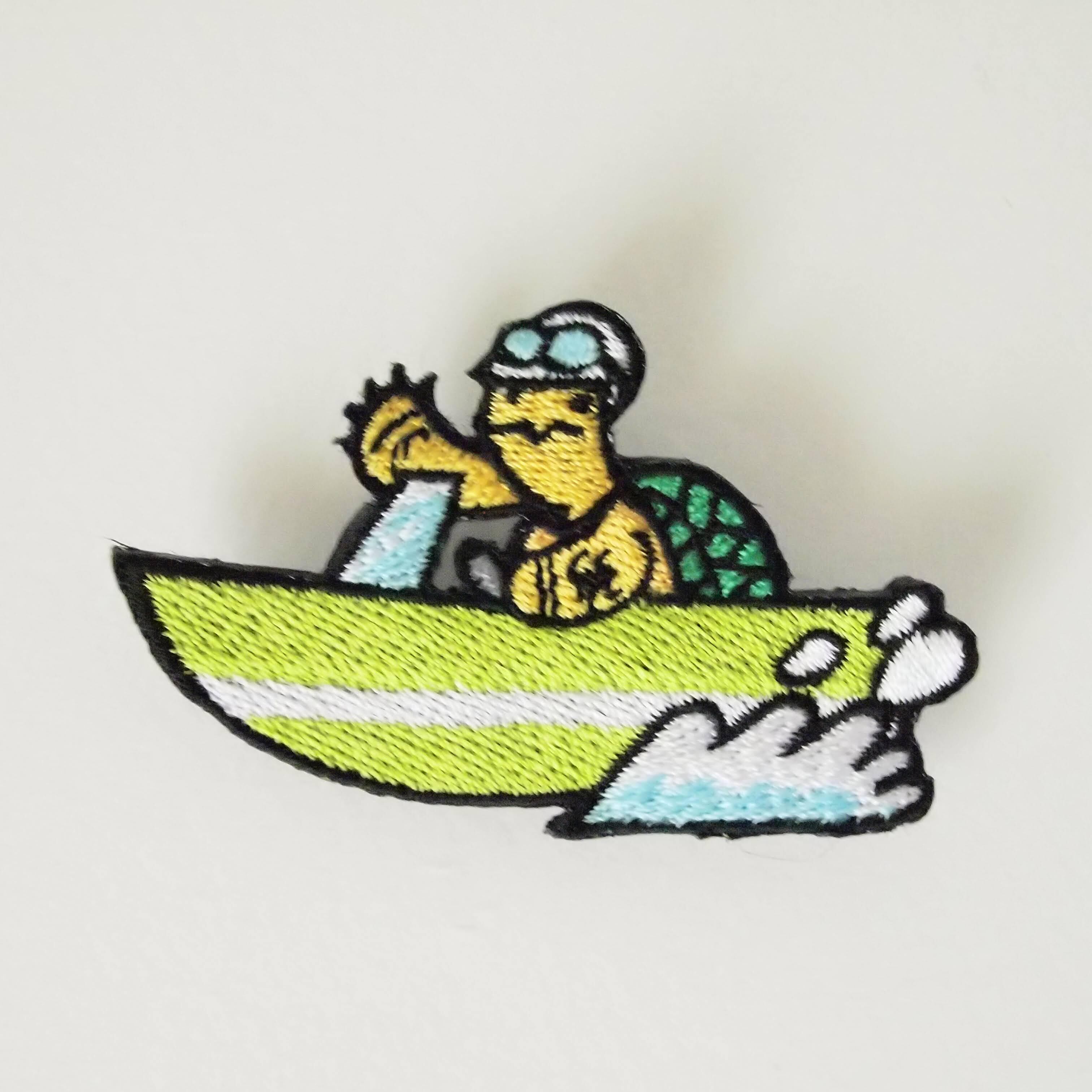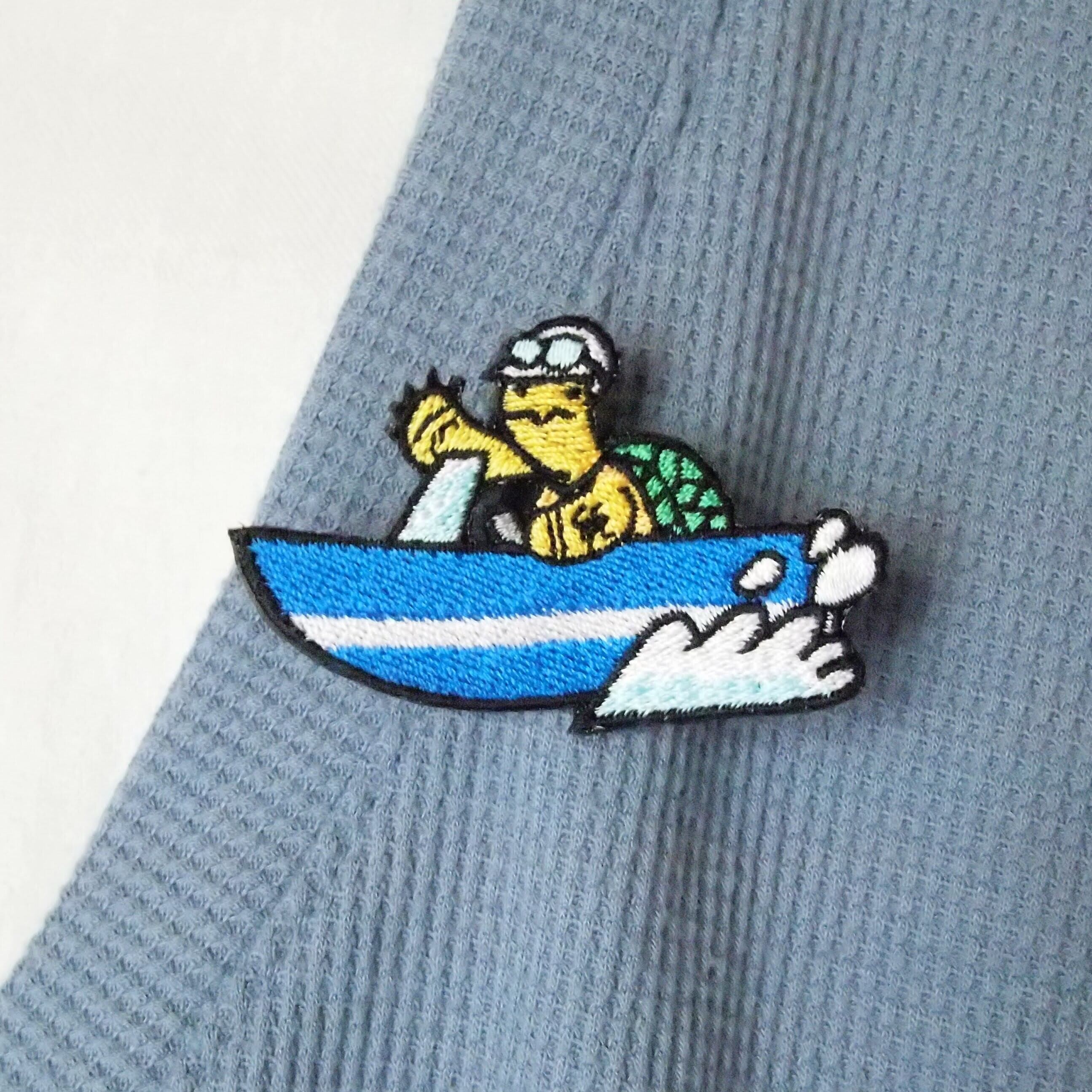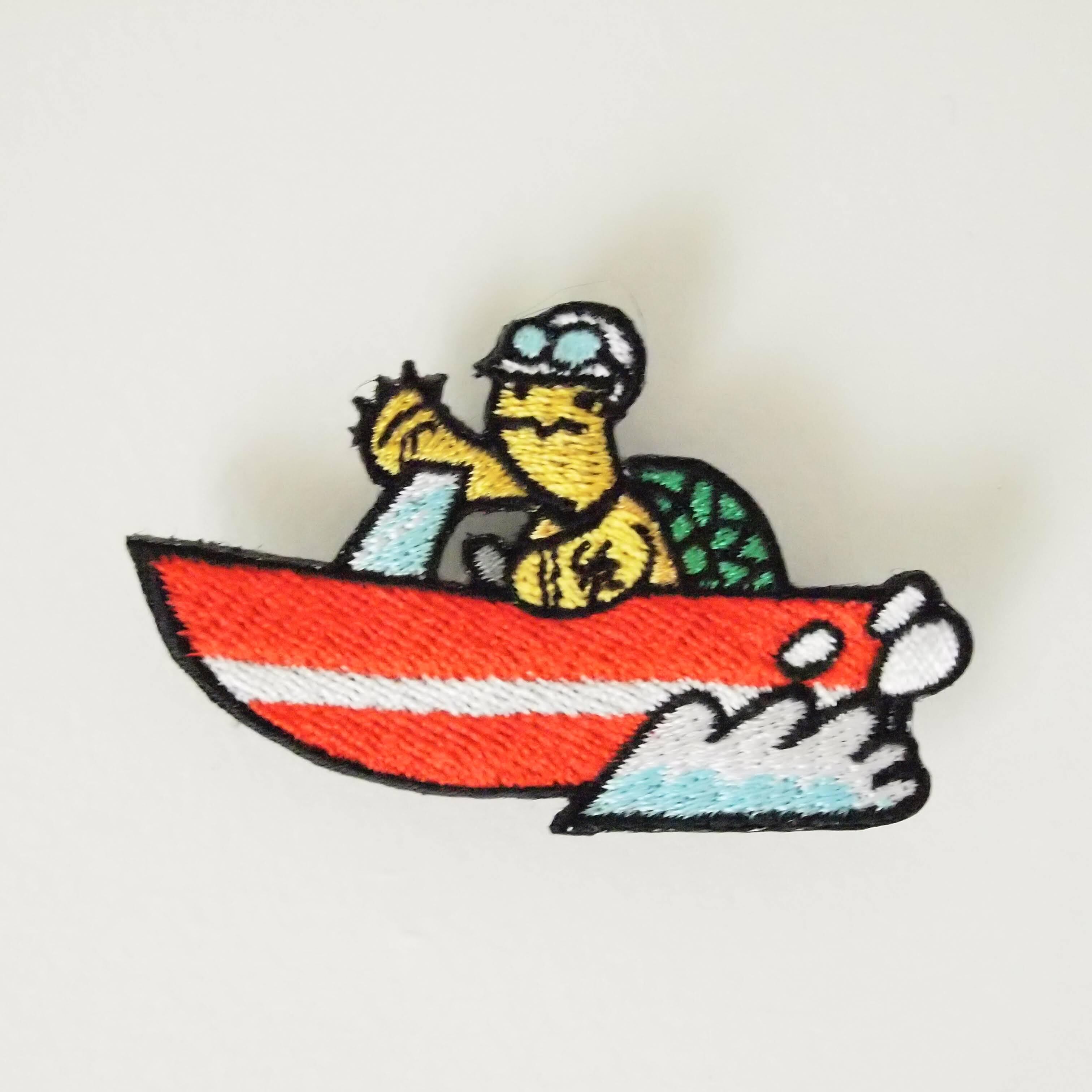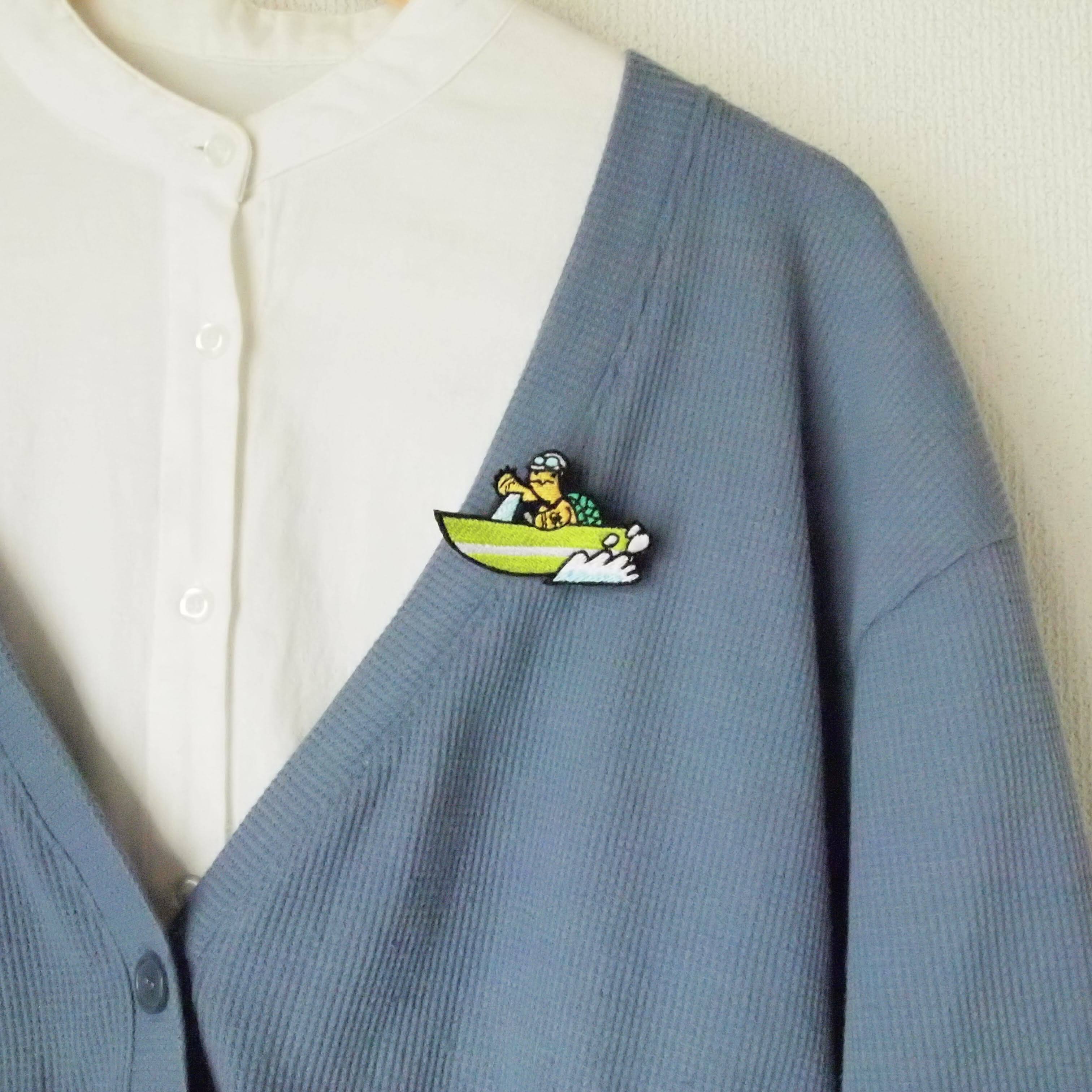 刺繍ブローチ / バッジ ボートに乗る亀さん 赤 青 黄緑のボート